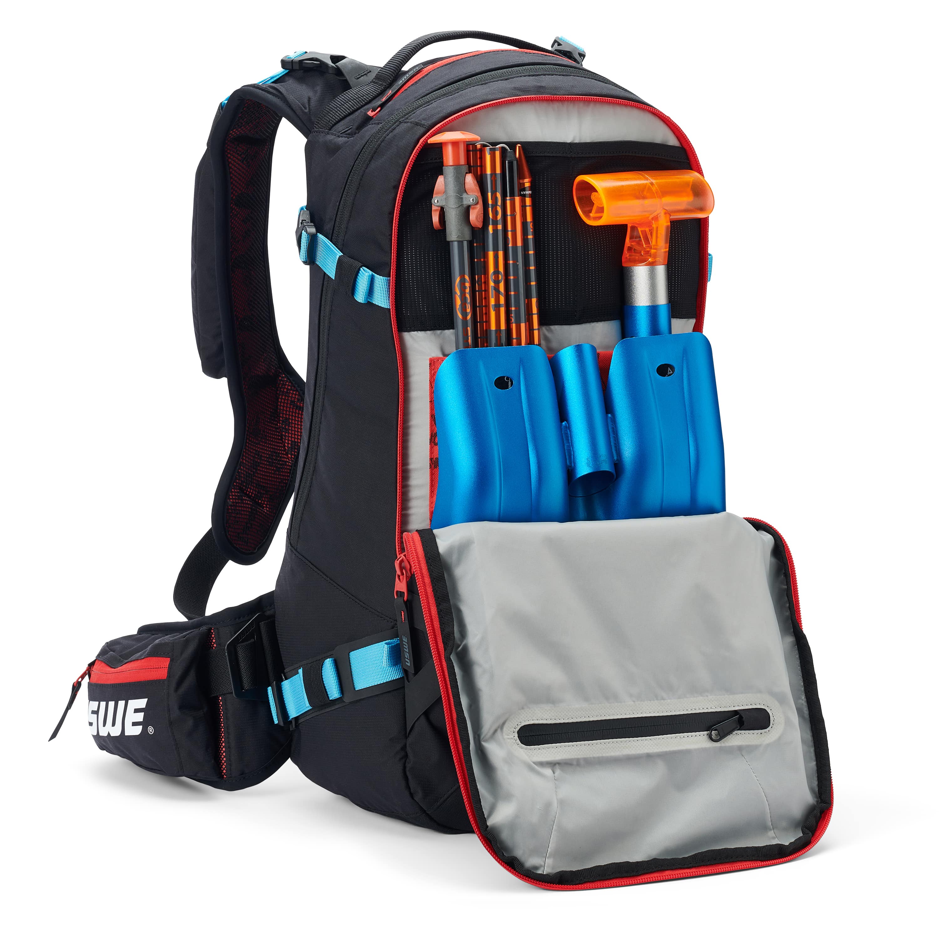 At the back there’s a quick access Avalanche Equipment pocket, where you can store your safety gear. There’s also an external helmet carry system, a snowboard carry system, and the ski carry system on the side. The waist belt got two quick access pockets and the pack got a google pocket where you can also safely store your precious goggles. We even threw in a microfiber cleaner tissue... we thought of everything! If you want a slim profile, you can tuck everything together with the outside compression system.